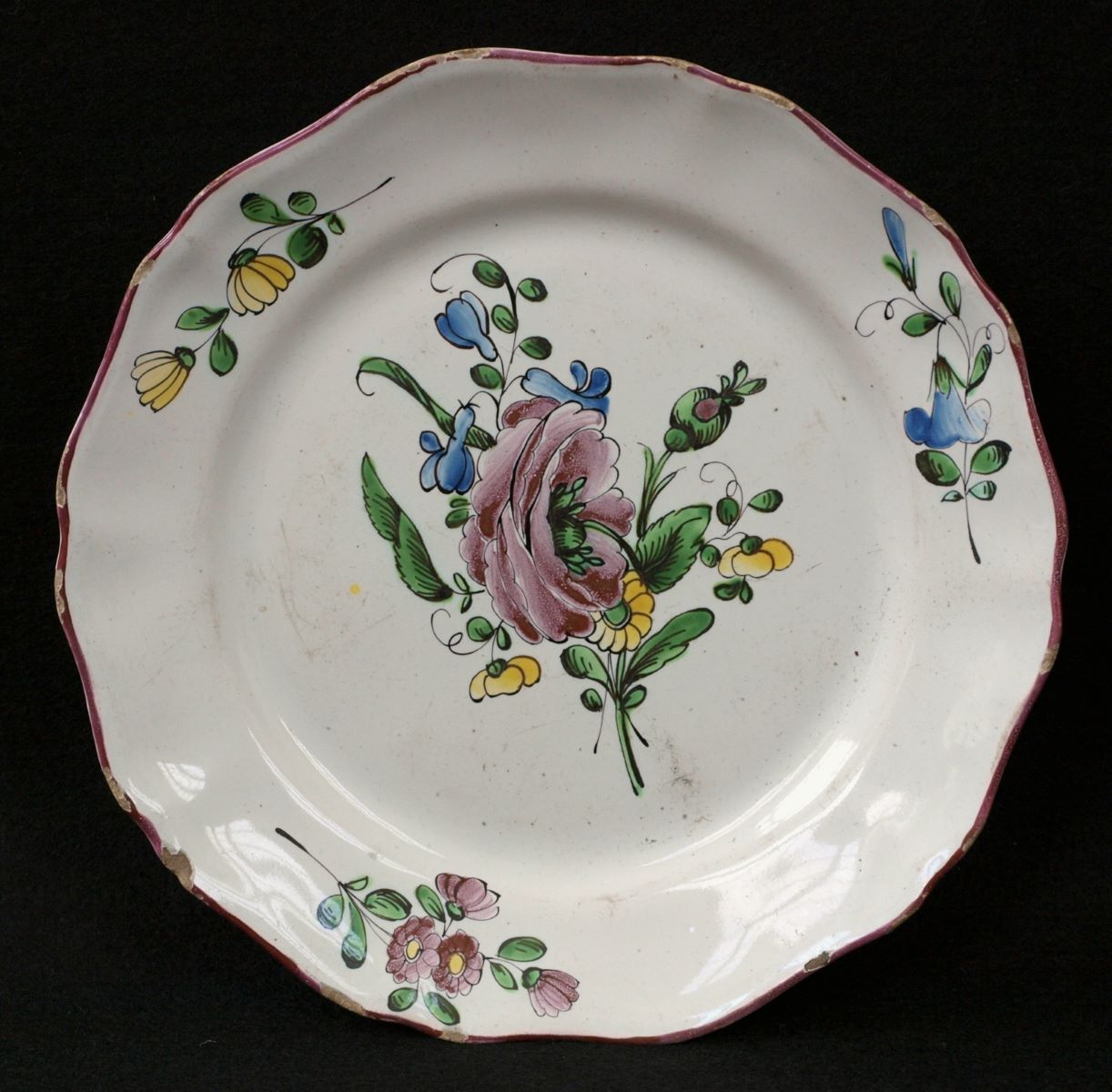 assiette en faïence stannifère de petit feu. Décor polychrome d’un bouquet (Strasbourg) avec une grosse rose aux pétales retroussés, et de trois tigelles sur l’aile bordée d’un filet pourpre. Email blanc. De forme circulaire, à bord contourné, dessous à talon.