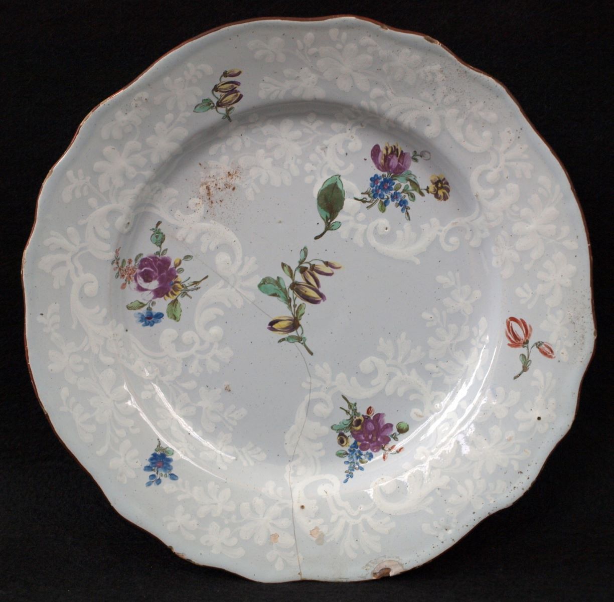 assiette en faïence stannifère de petit feu. Décor polychrome de fleurs fines au naturel et de cartels à fleurages rehauts blancs. Email gris-bleuté, de forme circulaire à bord contourné souligné d’un filet brun, dessous à talon.