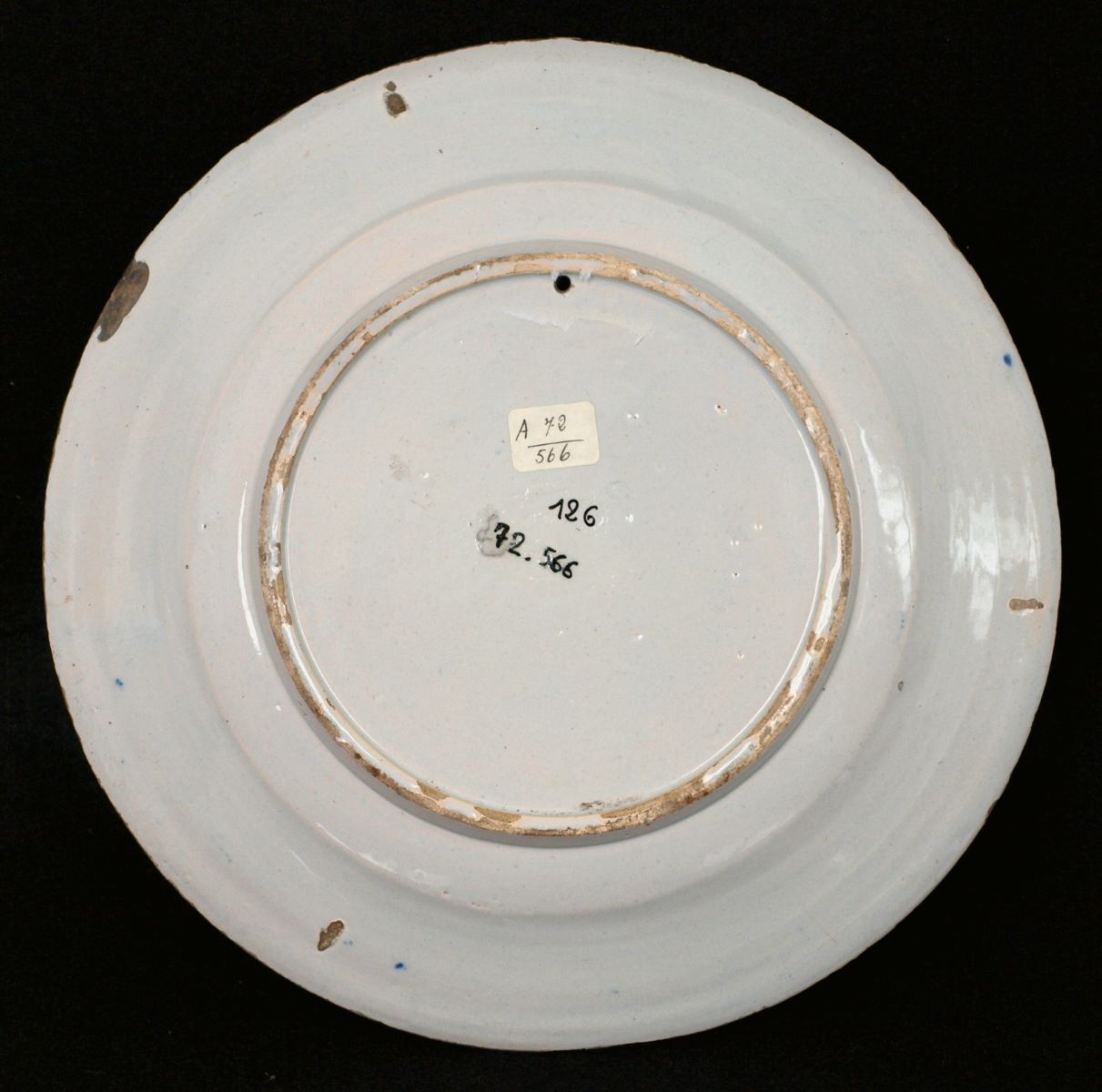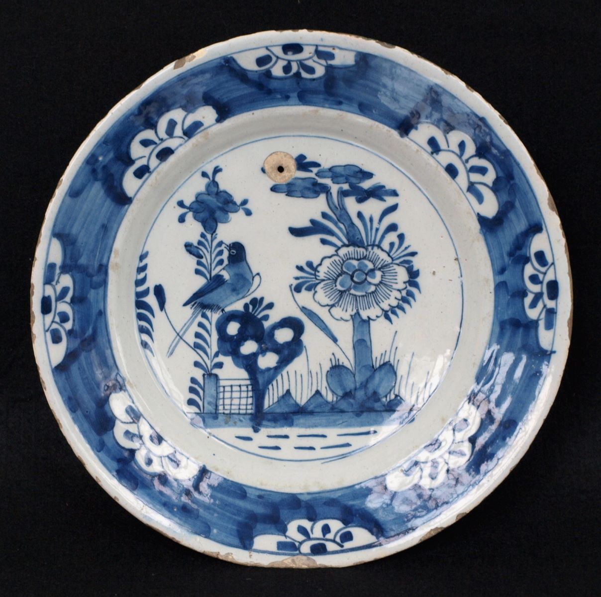 Plat en faïence stannifère de grand feu ; décor bleu d’un oiseau posé sur ce qui semble être un rocher percé ou un végétal, entouré de végétaux rustiques, inscrite dans un cercle au fond ; sur l’aile, décor végétal de demi-marguerites ; forme circulaire à talon.