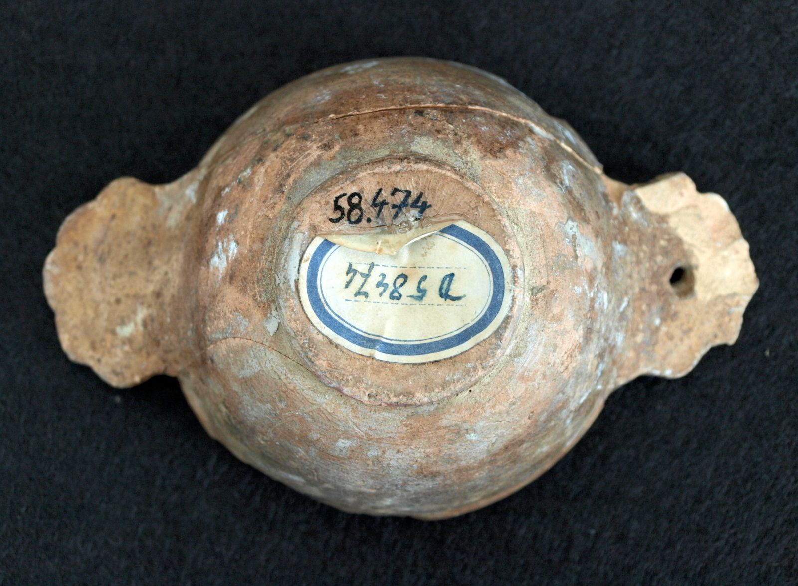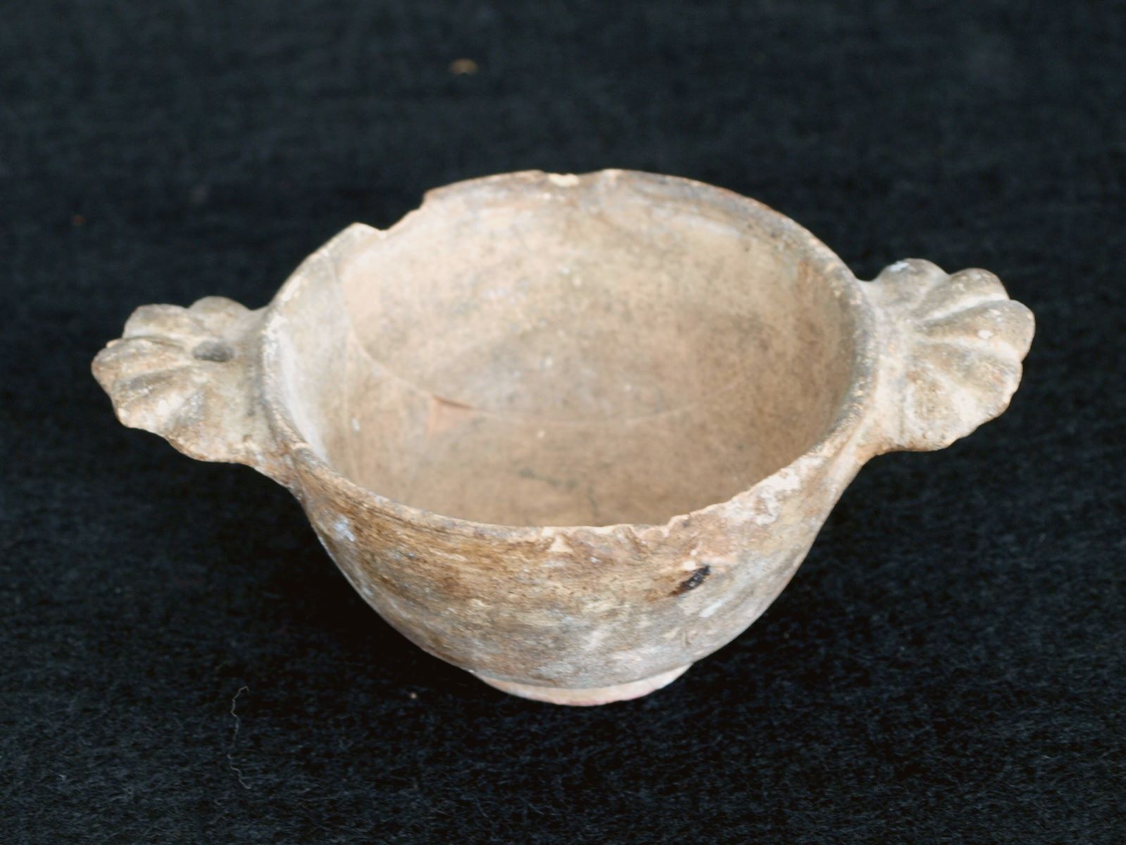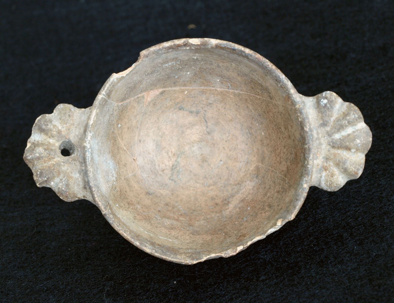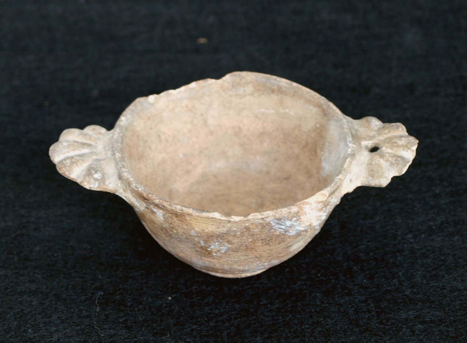 Gobelet en biscuit de forme hémisphérique muni de deux anses plates horizontales dont l’une est trouée.