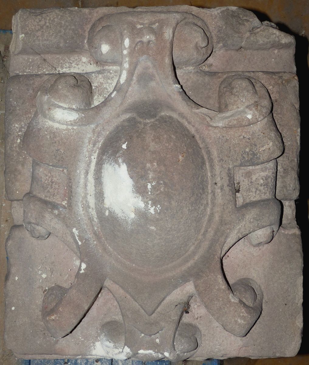Pierre de façade en grès sculptée d’un ove central cerné d'enroulements. L'ove figurait vraisemblablement un blason peint. Des traces de polychromie semblent en attester.