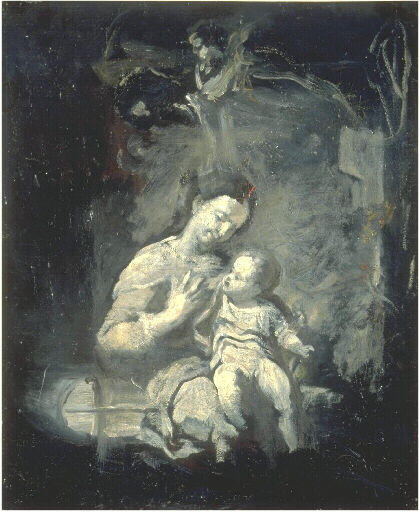 Si quelqu'un pouvait copier le Corrège, ses tableaux perdraient beaucoup moins que ceux du Titien à être copiés en une seule couleur : avec la simple couleur noire par exemple (Stendhal). Libre interprétation du motif central de la Vierge au panier du Corrège, à la National Gallery de Londres (cf. Corrado Ricci, Corrège, Paris, 1930, no CXLVI, rep. ). Valenciennes conserve également un dessin du même motif, plus conforme à l'original, et annoté au dos : Carpeaux, d'après Corrège, Londres - B Chérier (Val. CD 1217). [Catalogue : peintures et sculptures Jean-Baptiste Carpeaux, 1978]