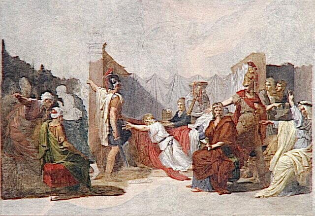 Cette esquisse où apparaît très lisiblement le jeu des lignes de la construction témoigne bien du style théâtral d'un artiste utilisant tout un répertoire d'attitudes dramatiques. On notera le parti pris original de la présentation qui situe au centre du tableau (et non sur le côté comme il est fréquent à l'époque) l'épisode principal de la composition et, d'autre part, la présence de ce personnage tourné vers le spectateur dans une attitude directement inspirée des représentations théâtrales et maintes fois reprises par Guérin dans ses oeuvres. Jean Lacambre