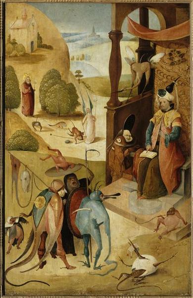 Ce panneau peint des deux côtés faisait probablement partie d'un triptyque dont il constituait un des volets. Sur une face on peut voir deux épisodes de la légende de saint Jacques le Majeur empruntés à la Légende dorée : au premier plan le magicien Hermogène parlemente avec les démons chargés de capturer saint Jacques. Ce dernier est représenté à l'arrière-plan, il s'avance précédé d'un ange qui tient à ses côtés les démons devenus dociles et inoffensifs. Au revers le panneau représente saint Antoine en train de lire devant une maisonnette dont l'entrée est surmontée de symboles antonins et de l'image du saint. Devant l'entrée du jardin clos un musicien ambulant et deux mendiants invalides se querellent. La popularité extraordinaire de saint Antoine tenait à sa réputation de saint guérisseur. On l'invoquait contre la peste et surtout le mal des ardents, sorte de gangrène qui entraînait l'amputation. La paternité de cette oeuvre, longtemps donnée à Jérôme Bosch, a été remise en cause au profit d'un disciple ou d'un copiste interprétant une oeuvre du maître aujourd'hui perdue. Il demeure que les couleurs très vives, le graphisme incisif, la figuration de l'espace arbitraire tout comme les nombreuses créatures extravagantes appartiennent incontestablement à l'univers du grand peintre fantastique. Patrick Ramade