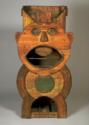 Cadre de bois de forme rectangulaire, ouvert sur le dessus, recouvert sur ses faces latérales de tissu, face principale en bois sculpté représentant un diablotin (?), composition à base de cercles : tête avec bouche ouverte d'où pend une langue et yeux mobiles, corps et jambes, dans un demi-cercle, avec ouverture en bas et dans la gueule