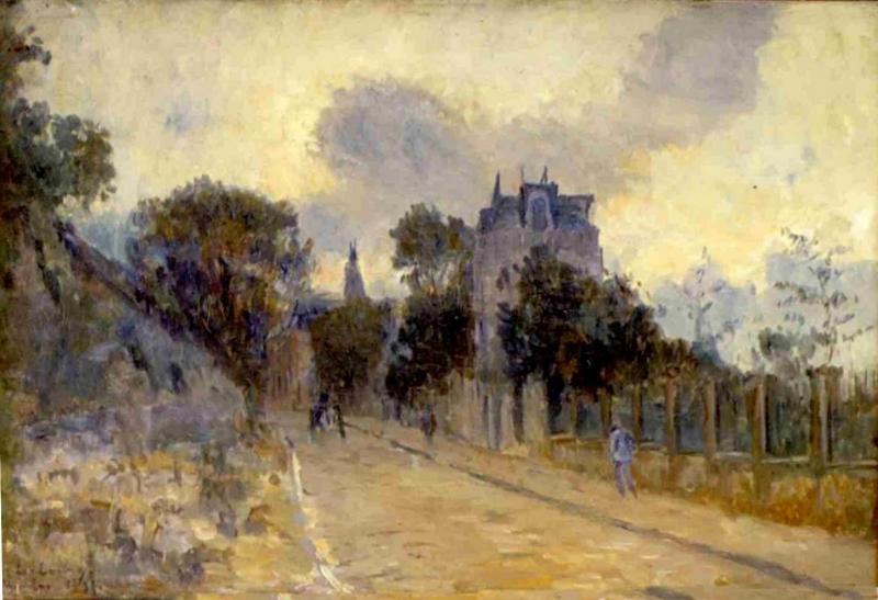Une rue de Meudon, sur la gauche un mur bordé d'arbres; au centre une rue pavée animée d'un groupe de personnages, bordée sur la droite par un trottoir sur lequel se tiennent deux piétons; à droite, un muret brodé d'arbres, avec en arrière-plan des bâtiments dont un château à droite et une église au fond ?