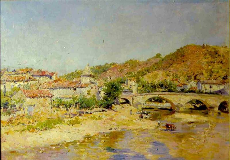 Village de Laguépie à droite au premier plan, l'Aveyron dont la berge est animée à gauche d'un groupe de personnages, de vaches qui s'abreuvent et au second plan à gauche, un pont menant au village installé sur la berge du fleuve; A l'arrière plan, à droite une colline boisée