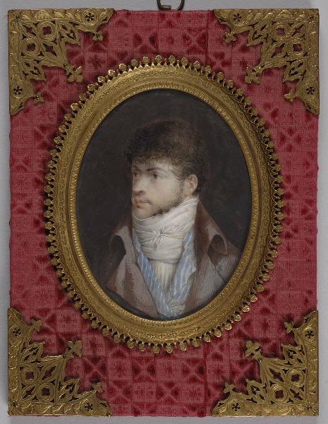Portrait du miniaturiste Aubry en buste, de trois-quarts gauche, vêtu d'une redingote, d'un gilet bleu rayé, et d'une chemise blanche à haut col, portant des favoris et les cheveux ramenés en avant. Cadre rectangulaire, en bois tendu de velours cramoisi, et orné de décors en cuivre d'inspiration gothicisante, avec une ouverture ovale, et anneau de suspension (moderne?).