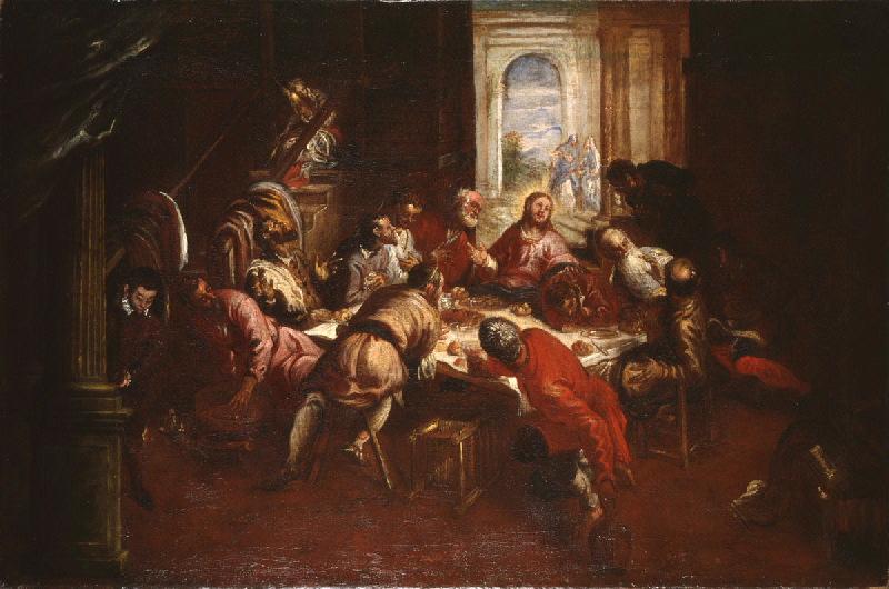 Le thème de la cène a souvent inspiré Tintoret. Toutefois la version de Caen suit encore la tradition, c'est-à-dire met en scène le moment où le Christ vient de prononcer 'L'un d'entre vous me livrera'. (Mathieu,26,21; Marc, 14,18; Luc,22,21; Jean, 13,21) Les apôtres traduisent ici avec vivacité leur étonnement alors que Judas, vêtu de rouge vif, interrompt son geste de prendre une fiasque sur le sol; l'ensemble est sombre, mis à part la lumière surgissant d'un portique dans le fond, qui auréole le Christ. D'après la version des saints Gervais et Protais de Venise. Version de San Trovaso, à Venise. Longtemps considéré comme copie ou esquisse.