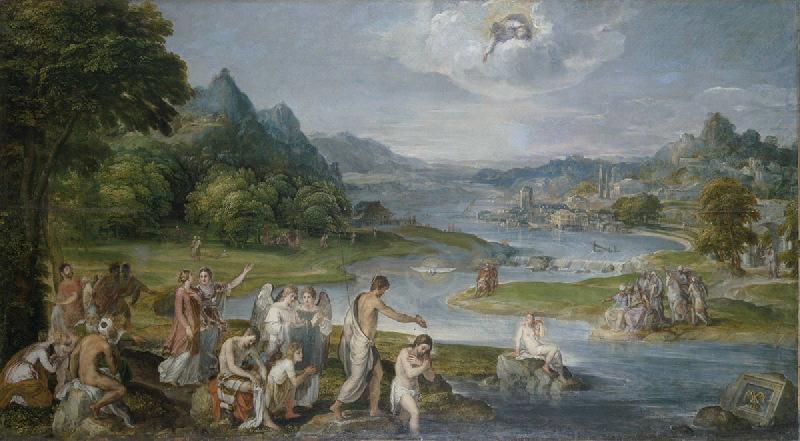 scène biblique (Baptême du Christ, Dieu le Père) ; fond de paysage (montagne, fleuve, ville)