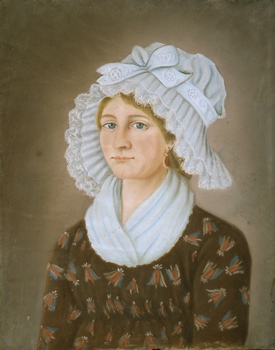 Dessin au pastel sur papier de couleur gris-bleu. Portrait présumé de Charlotte Corday âgée de dix-huit ans environ. Représentée de trois-quarts droit. Vêtue d'une robe brune parsemée de fleurs. Elle porte autour du cou un foulard blanc et sur la tête une coiffe normande.