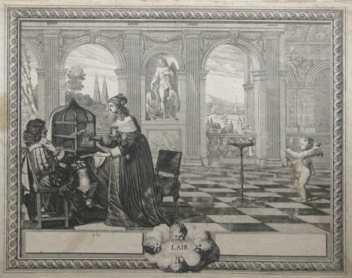 Scène d'intérieur symbolisant l'un des quatre éléments, ici l'air. A gauche, un homme et une femme donnant à manger des cerises à un perroquet. Sur la droite, un angelot tient en laisse un moineau.