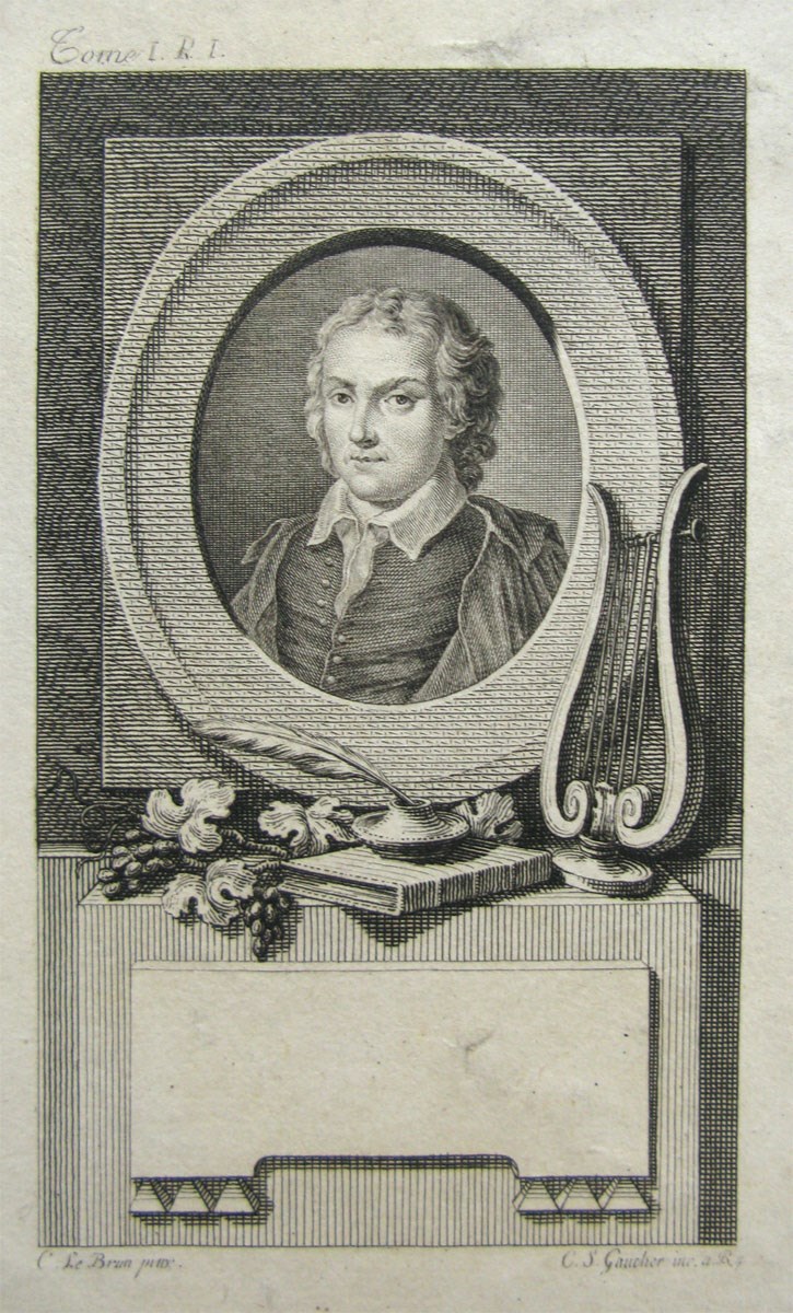 Eau-forte reprise au burin ? ; Portrait de Chapelle. Représenté en buste, de trois quart gauche, le regard de face dans un ovale équarri. Une lyre et un livre accompagnent l'ovale.