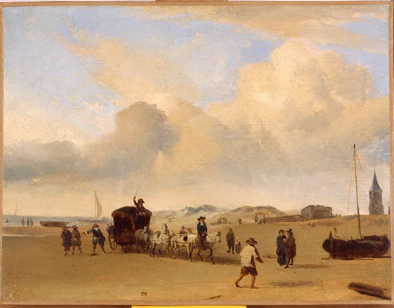 Après avoir étudié les peintres néerlandais, Boudin copie "Noble équipage cheminant sur la plage de Scheveningen", peint par Adrian van de Velde en 1660 (Louvre Inv. 1915). Eugène Boudin découvre les Pays-Bas assez tard. Il peint la Plage de Scheveningen en 1875, 1876, 1879 et 1890 et il représente, comme les plages normandes et du Nord de la France, les pêcheurs et leurs barques.