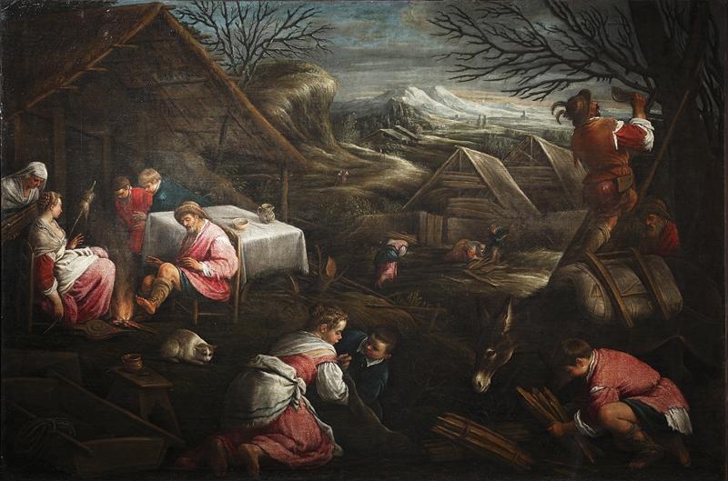 numéro, au dos, sur la toile : Dans l'angle supérieur droit. A la craie blanche : 5 ; inscription, au dos, sur la toile : Dans l'angle inférieur droit : le mot ' inconnu ' manuscrit et barré, à la craie blanche : 5 bis inconnu ; inscription, sur le châssis : Dans l'angle supérieur droit. Manuscrit au feutre sur étiquette : BASSANO / l'Hiver