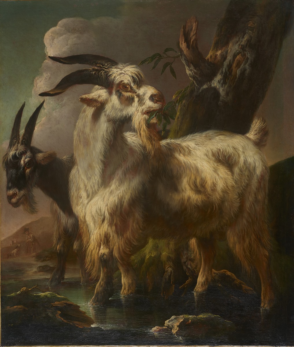 (Chiffres arabes), Sur la face : En bas à gauche. Manuscrit au pinceau et à l'huile, en jaune., 305 ; (Chiffres arabes), Au dos, sur la toile : Par deux fois, dans l'angle inférieur gauche et dans l'angle supérieur droit. Manuscrit à la craie blanche., 78 ; (Français, Latin), Au dos, sur la toile : Dans l'angle supérieur droit. Manuscrit à la craie blanche., Hollande ; (Latin), Sur la traverse centrale : Au milieu. Manuscrit à la plume et à l'encre noire sur étiquette., Roos (Phillippe) / Chèvres ... ; (Français, Latin, Chiffres arabes), Sur le montant gauche : Au milieu. Imprimé à l'encre noire sur étiquette., ROOS Philipp Peter / Francfort 1655 ou 1657 - Rome 1706 / DEUX CHEVRES TRAVERSANT UNE MARE / Donation Thomas Henry 1835 ; Sur l'objet