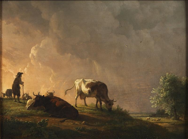 signature, date, sur la face, en bas à gauche. Au pinceau et à l'huile en noir. Inscription en partie effacée : B. P. Ommeganck 1785 ; inscription, au dos du panneau : Au centre. Manuscrit à la craie blanche. Annotations en palimpseste partiellement effacées : 71 hollan[...] ; inscription, au dos du panneau, à gauche. Manuscrit à la plume et à l'encre + feutre noir sur étiquette adhésive : Baltasar - Paul Ommeganck. / Patres gardant des troupeaux / 71 ; inscription, au dos du panneau, en haut à droite. Imprimé à l'encre noire, rouge et verte : LP ART [logo LP ART] Tél : 0033 5 62 47 07 77 / ET.1.07.003.BT / Fax : 0033 5 62 47 04 14 / Dossier : Le Chemin de Millet / Prêteur : musée Thomas Henry - Cherbourg - CHERBOURG / Titre : 0011-Pâturage ; inscription, au dos du panneau, en haut à droite. Imprimé en noir et manuscrit au stylo noir sur étiquette : [...] No. / case 28 ; inscription, au dos du panneau, à droite. Manuscrit au stylo noir sur ruban adhésif.