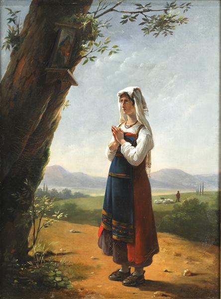 scène (Rome, paysanne, debout, prière), fond de paysage