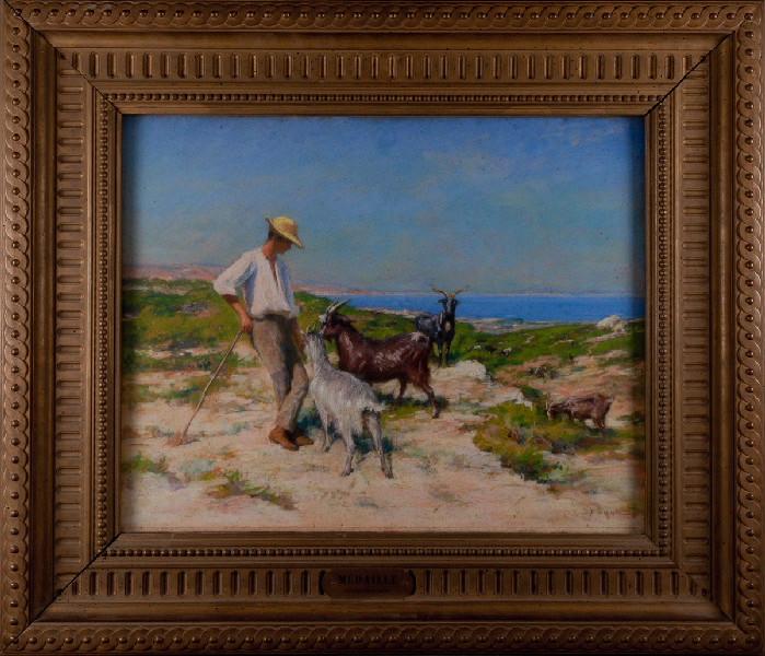 scène (Châteauneuf-les-Martigues, berger, chèvre, chapeau, bâton, bord de mer)