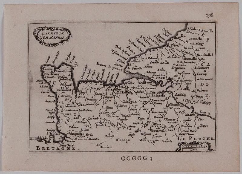 numéro, en haut à droite : 398 ; inscription, en haut à gauche : CARTE DE / NORMANDIE. ; échelle, en bas à droite : Echelle de la carte, dans la gravure ; inscription, en bas au centre : Sous la gravure : GGGGG 3