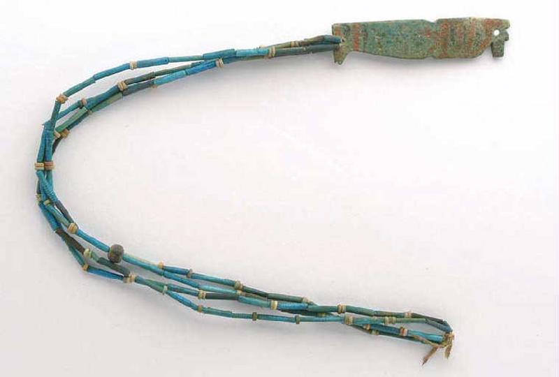 Les perles et l'amulette-pendentif qui composent le collier proviennent probablement d'éléments de résille de momie ; le remontage de l'ensemble en collier est vraisemblablement moderne