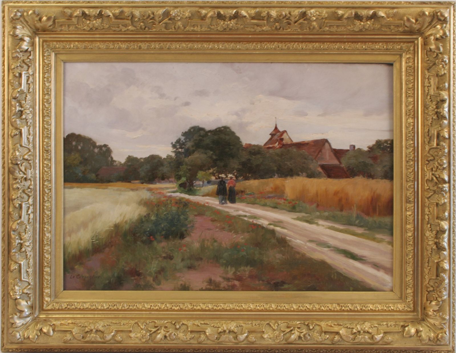 campagne (paysage rural) (femme, robe, corsage, manteau, coiffe (costume féminin), église, village, arbre, plante, fleur, chemin, promenade, champ, blé, clocheton, eté)