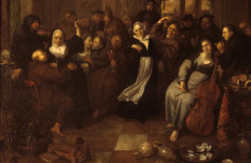 Elève d'Adriaen Van Ostade, Brakenburg critique dans cette toile la religion catholique. Le catholicisme apparaît perverti et corrompu, en opposition avec le protestantisme. Le banquet, dont il n'est représenté, dans cette scène, que les reliefs et la fête qui l'accompagne, est l'occasion, pour le peintre, d'exprimer une critique très virulente à l'égard de la religion catholique. Danses, ripailles et beuveries, auxquelles se livre cette assemblée, symbolisent la consommation des plaisirs de la chair condamnés par les principes du protestantisme. Le catholicisme apparaît ici perverti, corrompu et ne peut en aucune façon être un recours pour le secours de l'âme. La nature morte, qui occupe le premier plan du tableau renvoie à la symbolique des vanités. A droite sur une table recouverte d'un lourd tapis (symbole de l'opulence terrestre) des fruits, raisin et oranges, sont disposés sur un plateau d'argent. L'orange, dont le zeste pend en un long ruban continu, suggère le temps qui passe et la consommation des plaisirs temporels. Au sol, gisent les biens consommés dont il ne reste que les corps vides et abandonnés, jarres et coquilles d'huîtres. Au XVIIIe siècle, les huîtres étaient réputées pour leur vertu aphrodisiaque. En 1651, un médecin, Johan van Beverwijck, écrivait en parlant des huîtres : ' elles éveillent l'appétit, le désir de manger et de faire l'amour, deux choses qui plaisent aux délicats et aux bons vivants '. Vidées de leur chair elles rappellent les plaisirs consommés et renvoie l'image de la mort qui ne conserve de l'homme que des os blanchis par le temps.