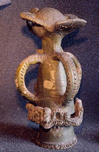 Email vert ; Epi de faîtage conique à 3 anses, sommé d'un pélican donnant à manger à ses petits (symbole de la Charité), décor en relief d'une guirlande circulaire et d'une couronne simplifiée