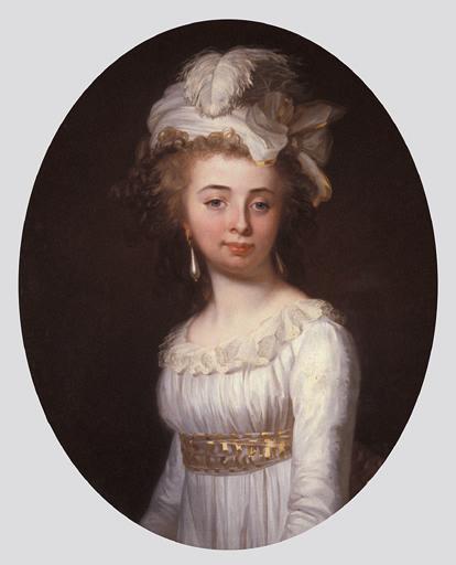 portrait (Banastre Marie-Françoise Henriette de, à mi-corps, robe, ceinture, perle, chapeau : plume)