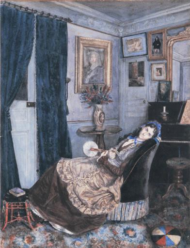 Dans un intérieur parisien, une dame allongée dans un fauteuil, regarde vers le spectateur. Plusieurs cadres recouvrent les murs ainsi qu'un miroir au-dessus du piano. Le tableaux situé au-dessus d'un vase de fleurs pourrait être une réduction d'un tableau de Bartolomé Esteban Murillo (1618-1682) représentant un portrait espagnol du Siècle d'or