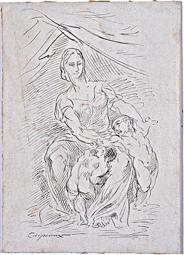 Extrait du catalogue Dessins d'Eure et d'ailleurs. 2001. '(..) ce thème de la mère assise, jouant avec deux de ses enfants sous un dais, selon une structure pyramidale qui évoque immédiatement les images de Charité, telle celle d'Andrea del Sarto (1486-1530), visible au Louvre et que put connaître Carpeaux. Puisque ce dessin ne peut être mis en rapport avec une peinture, il est nécessaire de le comparer à l'oeuvre sculpté de l'artiste. La composition la plus proche de ce dessin semble être celle de Notre-Dame du Saint Cordon, dont le modèle, de taille définitive, appartient aux collections du musée d'Orsay. Ce rapprochement permettrait d'évoquer une date autour de 1864 pour ce dessin, s'il n'était si éloigné, tant esthétiquement que techniquement, de la feuille à la gouache conservée au musée des Beaux-Arts de Valenciennes, que l'on sait pourtant avoir préparé la sculpture. (..) L'aspect trop retenu de ce dessin, l'insistance démesurée accordée aux détails anatomiques, et cette signature qui n'apparaît nulle part identique, jettent un doute sur la paternité de cette feuille (..) ' D. L.