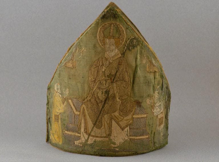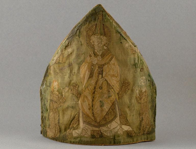 Sur l'une des faces: Saint Pierre, patron de l'église de Beauvais, est représenté trônant sur un pliant à têtes et griffes de lion, coiffé de la tiare conique, une clef d'or à la main. La tête aux cheveux gris et au menton puissant et carré est entourée d'une nimbe d'or, brodée d'une engelure ou arcature anciennement violette. Il est vêtu d'une aube blanche, d'une dalmatique d'or à parement violets, de la casula (trad : vêtement de dessus ), antique par dessus laquelle est posé le pallium et enfin de l'amict à parement doré. Il lève la main droite dans un signe de bénédiction qui s'adresse au centenier Corneille et à Dorcas, femme qu'il ressuscita selon la bible. Ces deux personnages bibliques sont à genoux à ses côtés, mains jointes. Corneille , vêtu d'une cagoule a rejeté son capuchon. Il a les cheveux blonds et sa cotte est doublée d'une étoffe rougeâtre qui parait au col et à l'extrémité inférieure. Dorcas, elle , est coiffée d'un voile , sous sa longue robe traînante, elle porte un surcot violet dont on n'aperçoit que le bout de la manche serrée. Sur l'autre face saint Eloi donne sa bénédiction, avec le même geste que celui de saint Pierre, à deux personnages habillés en pèlerins qu'on peut identifier comme étant Enguerrand de Marigny et sa seconde femme Alips de Mons. La tête de Saint Eloi est décorée d'un nimbe d'or à arcature violette. Son costume épiscopal se compose de la mitre verte galonnée d'or, de l'aube, de sandales blanches, de la dalmatique fauve et or, d'une chasuble. A son cou pend un pli de l'amict. Le banc sur lequel il est assis est en bois de chêne doré sur les moulures et tapissé de coussinets violets d'une broderie symétriquement piquée en losange. Ce banc est muni en avant d'un emmanchement un peu saillant sur lequel le saint appuie ses talons. De la main gauche, il tient sa crosse et son marteau d'orfèvre. La crosse a la hampe verte, le noeud et la volute d'or, le marteau est aussi réservé de fond de l'étoffe monté sur un manche. Le personnage masculin représenté aux côtés de saint Eloi est coiffé d'un béguin noué sous le menton et vêtu d'une robe à capuchon de couleur fauve et d'un surcot en drap d'or. La femme, est blonde également et elle est coiffée d'un voile blanc. Elle porte une tunique bleu clair, ombrée de violet, rehaussé de blanc. Tous les deux portent une besace ou pantière d'or suspendue à une bandoulière de même métal passée en sautoir. Elles sont décorées sur la partie inférieure de trois noeuds d'argent. Sur chacune des faces deux mains bénissant surgissent de chaque côtés. Les soufflets sont ornés de tiges d'églantier, garnies de feuilles mortes. De ces rinceaux s'échappent alternativement des boutons rosés, des fleurs