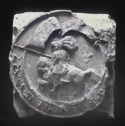 portrait (Montfort Simon de, en médaillon, équestre, armure, plume, portant : étendard (fleur de lys) ; cheval ; harnachement)