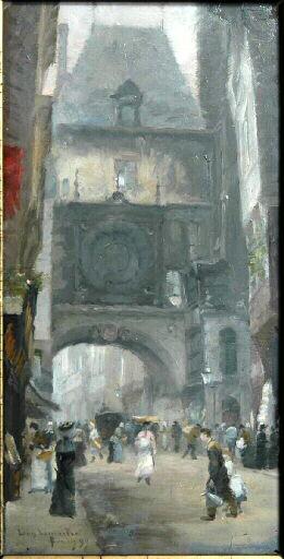 scène ; vue d'architecture (Rouen, ville, rue, personnage, beffroi, horloge)