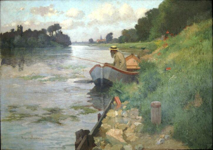 paysage ; autoportrait (fleuve, Seine, barque, homme : Jourdain Roger, peintre, pêche à la ligne)