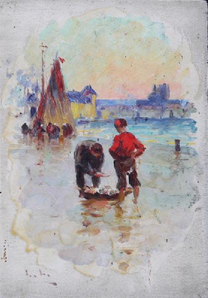 paysage (Dieppe, quai, port, église, marin pêcheur, panier, poisson, voilier, clocher)