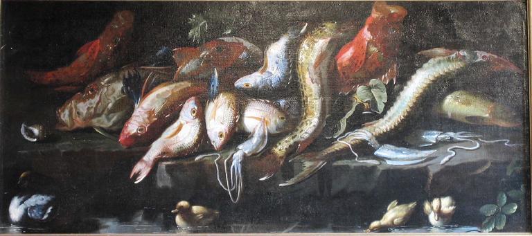 Le sujet : un ensemble de poissons et crustacés, posé sur une berge avec sur l'eau, au premier plan, quelques petits canards, est traité avec un brio exceptionnel dans une harmonie colorée inhabituelle. La géométrie d'une composition en éventail, le jeu brillant d'une harmonie colorée reposant sur le rapport bleu-jaune-rouge, font l'originalité de cette vigoureuse peinture. (P.B.)