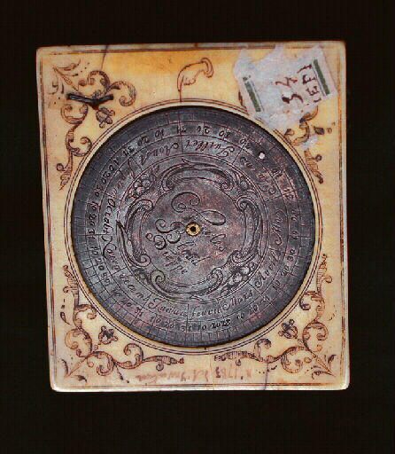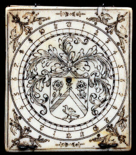 Disques en métal blanc (argent ou acier) gravé, ainsi que les crochets et charnières, et stylet de la règle de latitude. ; Papier imprimé en estampe (gravure sur cuivre) au fond de la boussole. ; Cadran armorié à boussole dont le couvercle est orné d'une armoiries bourgeoise c'est-à-dire non timbrée (...) au chevron d'azur surmontée d'une étoile accompagnée de deux roses avec leurs tiges c'est-à-dire naturelles, avec un oiseau prenant son vol en pointe ; de grands feuillages surmontent et accompagnent l'écusson. Les pièces métalliques sont en argent ; un crochet ; deux disques lunaires ; la boussole (aiguille et support) et sa vitre manquent. Le disque inférieur sous la boite, n'a pas de calendrier perpétuel. 'Ce qui nous a porté à acquérir ce cadran est uniquement l'armoiries gravée sur la boite (notre collection n'en possède aucune), laquelle parait appartenir à la famille d'Alleaume dont plusieurs membres seigneurs (...) environs de Neufchâtel-en-Bray ont appartenu à la magistrature. La famille d'Alleaume, d'après les nobiliaires, a pour armoiries : d'azur au chevron d'or accompagné en chef de deux roses d'argent et en pointe d'une colombe, la tête contournée surmontée d'une étoile le tout d'or. (Cf. Vergny, Cloches du Pays de Bray, p.168) A part quelques différences dans la position de l'étoile, les pièces (...) peut être attribuéé à une branche ou à un membre de cette maison. Au 17è s., des d'Alleaume de (...) étaient attachés au Parlement de Normandie (...) Face Ia : Cadran équinoxial à deux fois 12 heures et armoiries Face Ib : Disque lunaire radial de type II (gradué 1 à 30) et cadran équinoxial gravé sur l'ivoire (2 fois 12). Règle de latitude. Face IIa : Boussole et cadran analemmatique (V-XII-VII). Le papier imprimé au fond est orné d'un beau décor gravé, encadrant la liste des 16 (ou plus ?) villes et leur latitude. Face IIb : Disque à calendrier pour le règlage de l'ellipse de l'analemmatique interne, sans tableau perpétuel. Signé