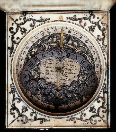 Signé sous la boite au centre du disque. Signature entourée d'une sorte de cartouche monumental., Charles Bloud ADieppe ; inscription dans l'oeuvre : Nom des villes et latitudes répertoriées dans un tableau à deux colonnes sur papier imprimé., Colonne de gauche : Dieppe. Anvers. Rome. Lisbonne. Milan. Lion. Peroue (?). (?) Colonne de droite : Rochelle. Amsterdam. Bruxelle. Monpelier. Tolose (?). Marseille. Venise. (?)