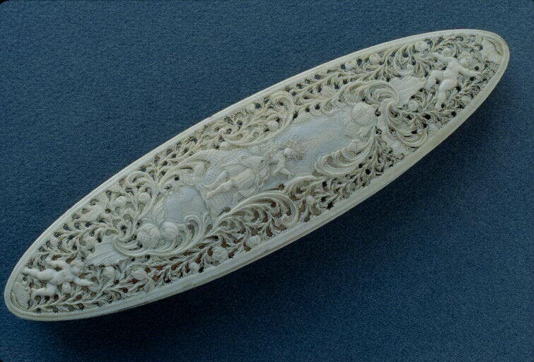 Sur la face principale, motif central représentant un berger assis, coiffé d'un large chapeau, jouant de la flûte devant ses moutons qui l'écoutent, tandis que le chien s'est endormi à ses côtés. Motif entouré d'une ornementation à jour d'une grande élégance de dessin et d'exécution, composée de petits compartiments quadrillés alternant avec des rinceaux comprenant quelques animaux. L'autre face, moins fine, est décorée dans le sens de la hauteur d'un cartouche orné d'une figure de Flore encadrée d'une ornementation de rinceaux à jour comprenant un enfant à chaque extrémité