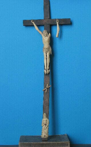 Christ avec ses attributs et Sainte Madeleine en os sculpté ; croix en bois teintée sans base sur laquelle sont cloués les figures en os du Christ et de Sainte-Madeleine à ses pieds. Entre eux deux subsistent les os (mais pas le crâne). Il est possible que le titulus ait disparu