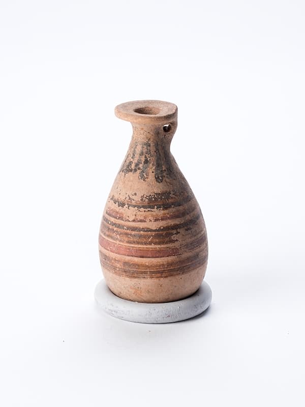 Matière : argile beige clair, peinture brun foncé, cuite brun clair sur les traits plus dilués, rehauts rouges Technique : tourné, peint, rehaussé ; Cet alabastre a panse ovoide présente un fond bombe. Le col, rétréci vers le haut, est muni d’un petit plat de l’embouchure, un peu déforme, a face concave, auquel est attachée une petite anse perforée. L’intérieur de l’orifice est peint. Sur le plat de l’embouchure court une bande et, sur l’épaule, une rangée de languettes. Sur la panse, du haut vers le bas sont peintes : une bande brune – une ligne brune soulignée par un filet en rehauts rouges – une bande brune – une ligne brune soulignée par un filet en rehauts rouges – une bande brune. Le reste du vase est réserve. Comparanda : cet alabastre appartient dans la classification de Dominique Frère au Groupe de Bruxelles A 1008 (Frere 1995, p. 121). Andras Marton, post-doctorant, EPHE (A.M.)