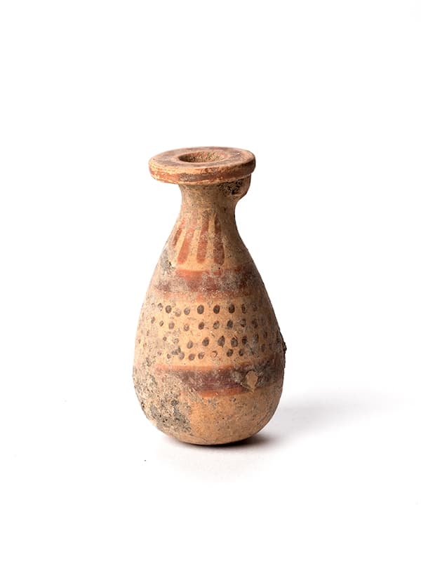 Matière : argile brun jaunâtre, peinture brun foncé, cuite par endroits brun orangé Technique : tourné, peint ; Il s’agit d’un alabastre a panse ovoide et au fond un peu aplati. Le col, retreci vers le haut, est muni d’un petit plat de l’embouchure a face droite, auquel est attachee une tres petite anse perforee. L’interieur de l’orifice est peint. Sur le plat de l’embouchure, concentriquement autour de l’orifice, une bande est soulignee par un cercle trace en rehauts rouges. Trois taches sur l’anse. Une rangee de languettes sur l’epaule. Sur la panse, quatre rangees de points entre deux larges bandes soulignees par une ligne peinte en rehauts rouges. Le reste du corps est reserve. Comparanda : cf. commentaire du Cat. n° 16. La forme et la presence de la petite depression sur le fond, proche des modeles corinthiens, indiquent peut-etre une datation plus ancienne a l’interieur du groupe. Le vase de Fecamp appartient dans la classification de Dominique Frere au Sous-groupe 1 de la Serie α2 du Groupe du Mans 51-31 (Frere 1995, p. 120). Andras Marton, post-doctorant, EPHE