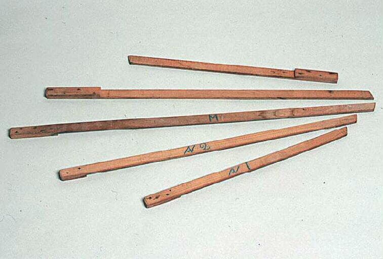 VOIR LES ELEMENTS ASSOCIES : 2001.9.20 Rivet cuivre ; 2001.9.4 pointes galvanisées de 55 ; 2001.9.2 Gabarit de sole de doris ; 2001.9.6 1-5 Gabarit de varangue ; 2001.9.7 Moule d'assemblage des membrures ; 2001.9.8 Plaque d'assemblage de membrures de doris ; 2001.9.9 Pointe galvanisée de 25 ; 2001.9.10 Gabarit de coupe de tête de membrure ; 2001.9.11 Chantier de construction de doris ; 2001.9.12 Gabarit de courbe arrière ; 2001.9.13 Gabarit de tableau ; 2001.9.14 Gabarit de correspondance entre sole et étrave ; 2001.9.15 Gabarit d'étrave ; 2001.9.16 Gabarit de tête d'étrave ; 2001.9.17 Gabarit de premier bordage ; 2001.9.18 pointes galvanisées de 70 ; 2001.9.19 Trusquin ; 2001.9.21 Canape ; 2001.9.23 pointes galvanisées de 40 ; 2001.9.24 Gabarit de culton ; 2001.9.25 Gabarit de poitrine ; 2001.9.26 1-2 Gabarit de banc ; 2001.9.27 Gabarit de serre de bancs ; 2001.9.5 1-5 Gabarit d'allonge ; 2001.9.1 Tréteau ; 2001.9.22 Gabarits de dessus de plat-bord