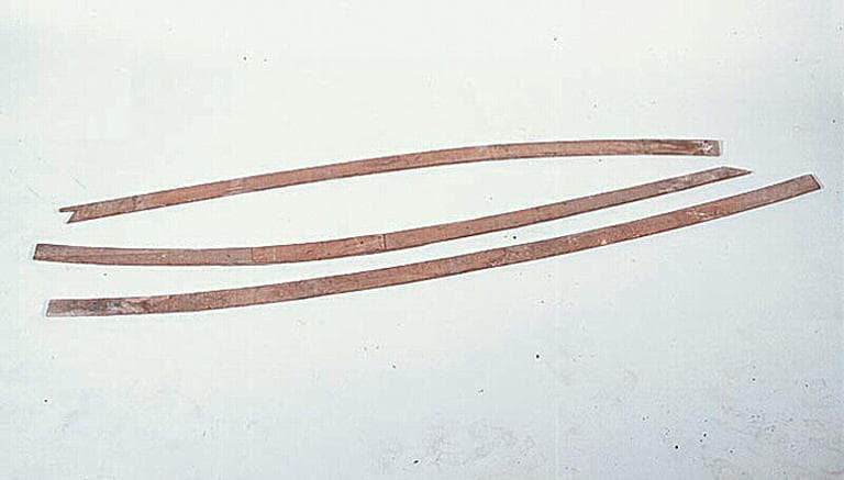 VOIR LES ELEMENTS ASSOCIES : 2001.9.3 1-5 Règle de traçage de membrure sur la sole ; 2001.9.4 pointes galvanisées de 55 ; 2001.9.20 Rivet cuivre ; 2001.9.2 Gabarit de sole de doris ; 2001.9.6 1-5 Gabarit de varangue ; 2001.9.7 Moule d'assemblage des membrures ; 2001.9.8 Plaque d'assemblage de membrures de doris ; 2001.9.9 Pointe galvanisée de 25 ; 2001.9.10 Gabarit de coupe de tête de membrure ; 2001.9.11 Chantier de construction de doris ; 2001.9.12 Gabarit de courbe arrière ; 2001.9.13 Gabarit de tableau ; 2001.9.14 Gabarit de correspondance entre sole et étrave ; 2001.9.15 Gabarit d'étrave ; 2001.9.16 Gabarit de tête d'étrave ; 2001.9.17 Gabarit de premier bordage ; 2001.9.18 pointes galvanisées de 70 ; 2001.9.19 Trusquin ; 2001.9.21 Canape ; 2001.9.23 pointes galvanisées de 40 ; 2001.9.24 Gabarit de culton ; 2001.9.25 Gabarit de poitrine ; 2001.9.26 1-2 Gabarit de banc ; 2001.9.27 Gabarit de serre de bancs ; 2001.9.5 1-5 Gabarit d'allonge ; 2001.9.1 Tréteau
