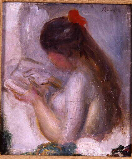 signature, en haut à droite : Renoir. ; étiquette, inscription, au dos : , 1 - au stylo vert 6 2 - étiquette autocollante avec inscription au stylo : 187 3 - inscription au crayon bleu : NO 4- inscription au crayon jaune : 340 5 - inscription au crayon rouge : 1296-ON 6 - trace d'une étiquette Ce cadre est un réemploi : il a été recoupé pour être adapté au format du petit tableau : certaines inscriptions ont été tronquées par la scie 7 - étiquette très lacunaire avec numéro à la plume, illisible 8 - étiquette autocollante avec inscription au crayon : 203 9 - inscription au crayon noir : Renoir 2856