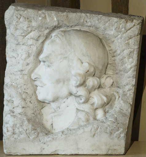 Bas-relief en marbre. Le portrait en médaillon rond est achevé ; le reste du bloc rectangulaire est juste laissé au stade du dégrossissage