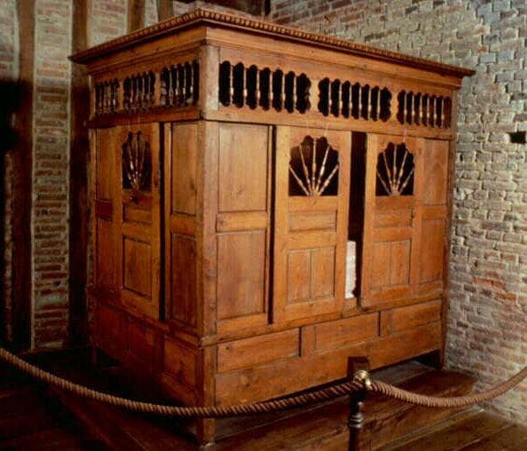 Lit-clos à portes coulissantes en orme et sapin rouge. Modèle destiné à être vu de 3 côtés et possédant cinq portes à balustre tournés rayonnants. Montants et balustres en orme, le reste en sapin un peu rouge
