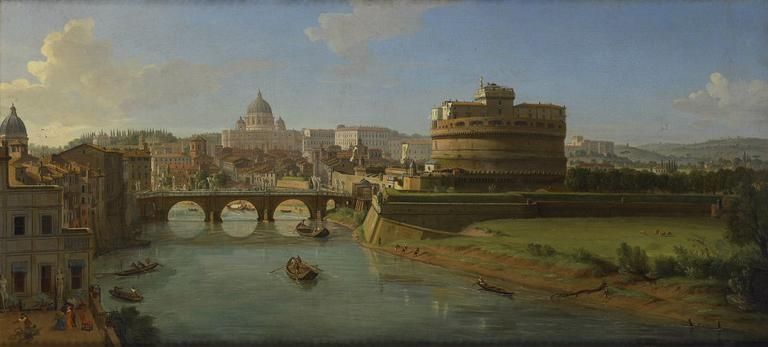 Le Tibre, le château Saint-Ange, Saint-Pierre, le pont Saint-Ange : un des plus jolis panoramas de Rome. C'est une vision contemporaine et vivante de la ville, hors des limites de ses restes antiques. La véracité topographique et la minutie des détails n'otent rien à la poésie du site rendu avec la richesse de ses couleurs et la limpidité de son ciel; vue urbaine, collines, embarcation, personnage.