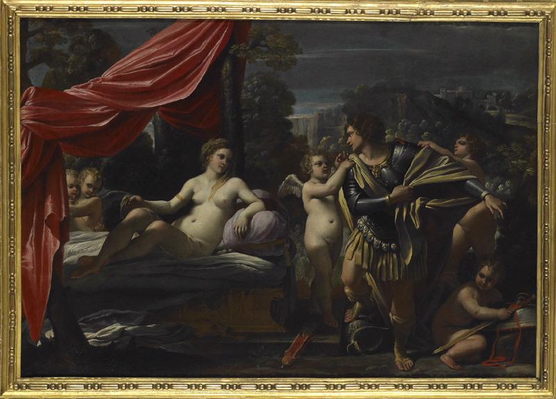 scène mythologique (Mars myth, Vénus, putto, cuirasse, nu, lit, draperie ; lit, relief) ; fond de paysage